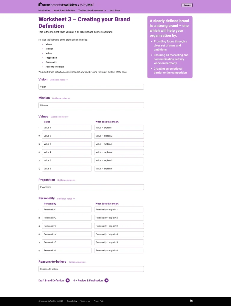 The toolkit walks you step by step through the thinking that underpins a strong brand, helping you define your Vision, Mission, Values, Proposition, Personality, and Reasons-to-believe in a structured and practical way.